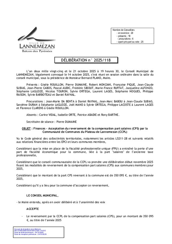 118 Finances Acceptation Du Reversement De La Compensation Part Salaires (Cps) Par La Communauté Des Communes Du Plateau De Lannemezan (Ccpl)