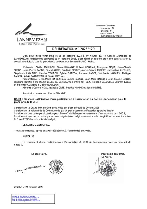 120 Finances Attribution D'Une Participation À L'Association Du Golf De Lannemezan