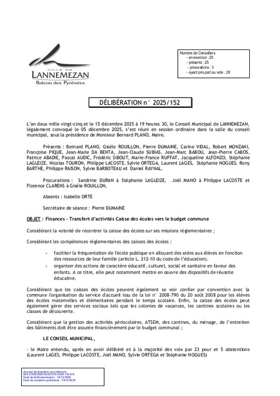 152 Finances Transfert D'ActivitéS Caisse Des ÉColes Vers Le Budget Commune